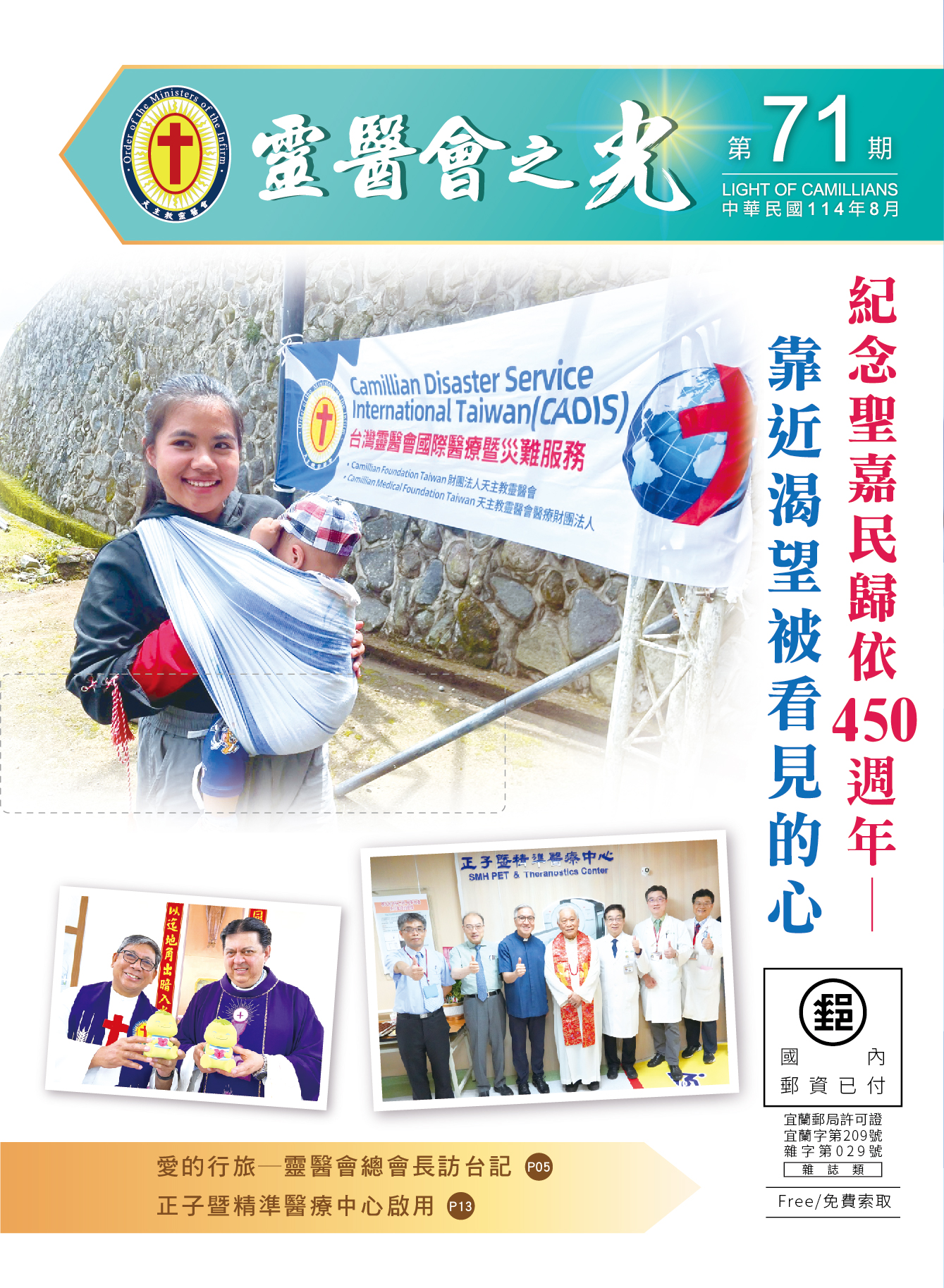 神父的話 回到歸依的啟點 工程進度 盛夏.新粧 封面主題 聖嘉民歸依450週年 被基督征服 愛的行旅:靈醫會總會長訪台記 飛越萬里,靠近一顆顆渴望被看見的心 社區照護 「你還好嗎?我不好」∣ 當98歲遇見17歲 醫護專區 正子暨精準醫療中心啟用 在宅急症照護來到惠民 有護理師才有未來 迷途,常是心靈覺醒的起點 募款記事 愛與奉獻的回聲∣來自宜蘭孩子愛的回音 郵差先生的一通電話,讓希娃不迷路 聖嘉民長照 圓失智照顧的夢 聖母醫專 用一顆種子的名義,為畢業的你送上愛